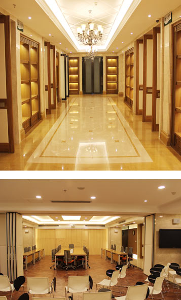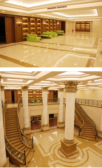 本工程包含办公大堂、会议中心、领导办公室、标准办公室、餐厅、电梯厅、公共卫生间等,体现成熟稳重的国企形象和风范为主要述求,与文化、明快、人性的现代办公理念相结合。8米高的中空大厅,墙地面采用白色、米黄、金黄的经典配色,显示出中空大厅空间明朗大气及办公空间的沉稳现代、舒适温馨。