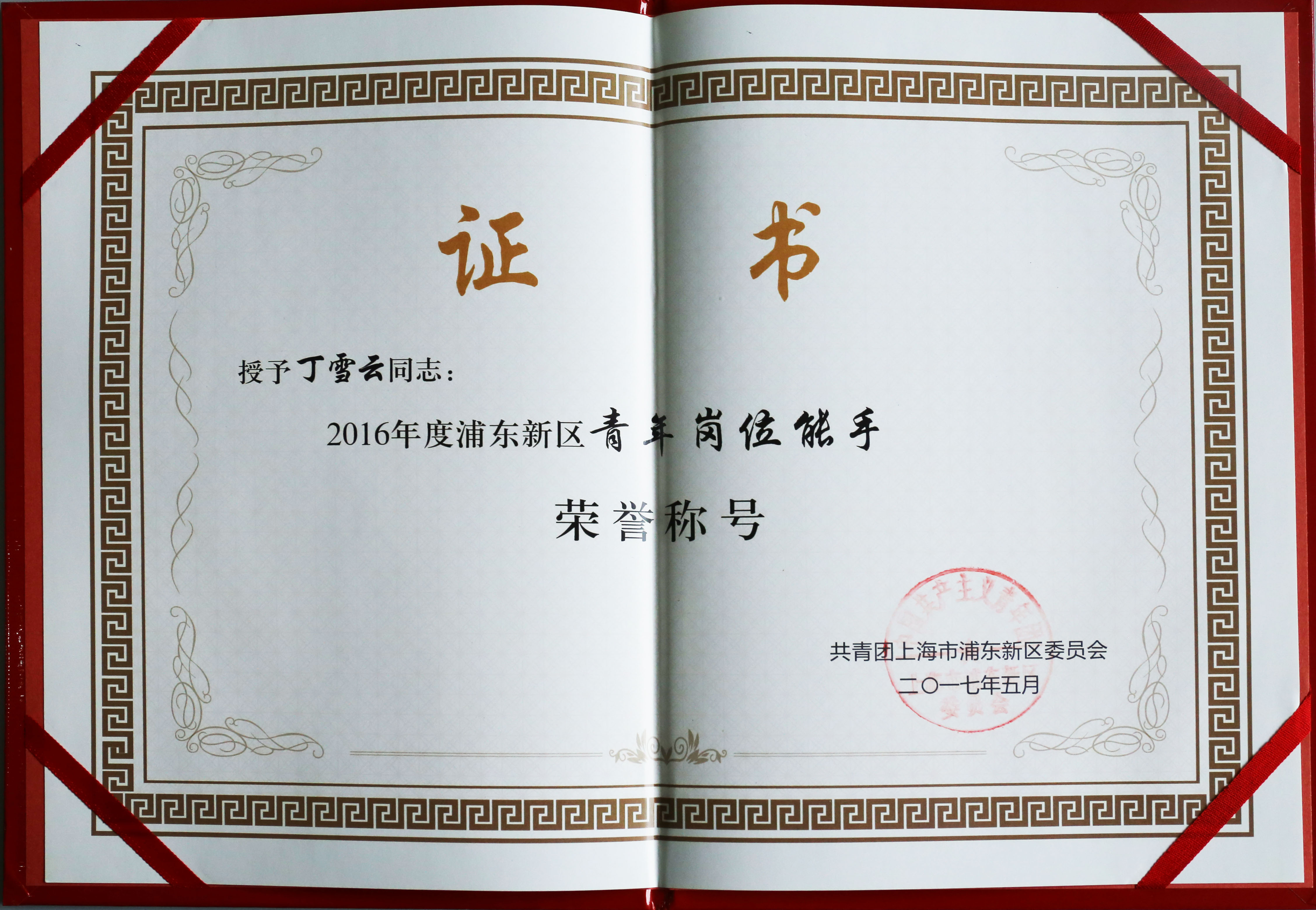 热烈祝贺丁雪云总裁获“2016年度浦东新区青年岗位能手”荣誉称号