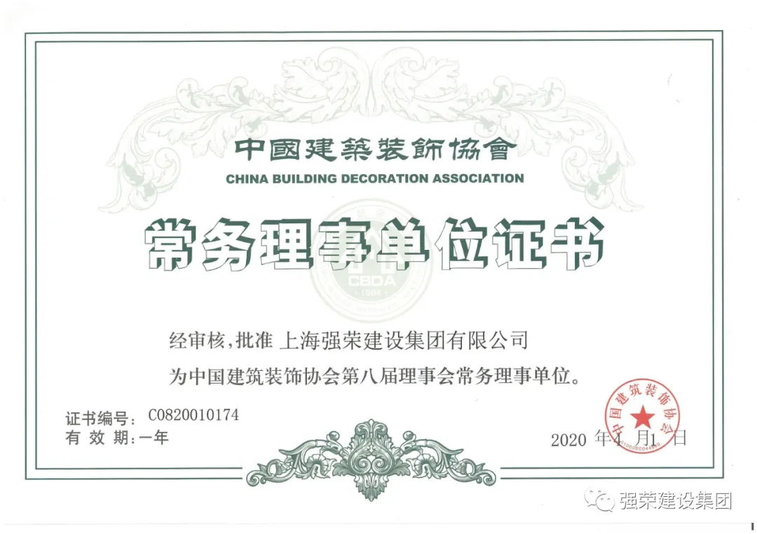 近日,从中国建筑装饰协会发来证书,上海强荣建设集团荣升中国建筑装饰协会常务理事单位