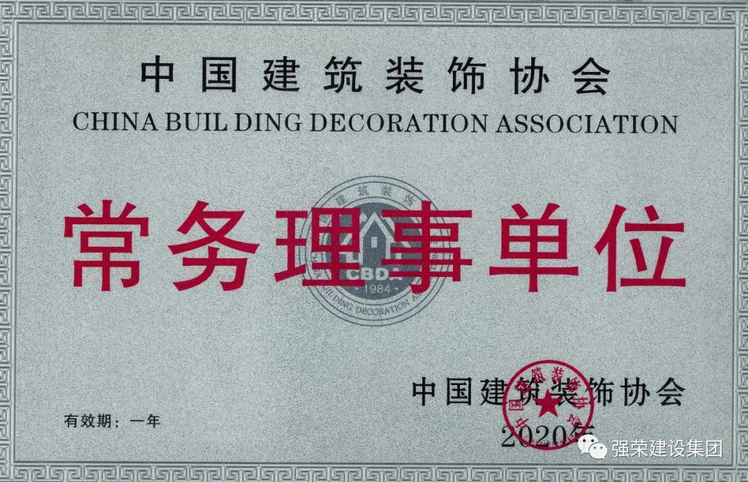 2020年4月,强荣集团正式成为中国建筑装饰协会常务理事单位,实现了入会三年由会员单位到理事单位再到常务理事单位的飞跃。一方面这是中国建筑装饰行业对强荣集团一心一意谋发展、精益求精做工程、积极履行社会责任的认可与肯定。另一方面,行业地位的提升也激励着所有强荣人继续以“安全是企业的生命,质量是企业的市场”管理理念严格要求自己,继续为社会和客户打造更多的精品工程,继续积极履行社会责任,不断提升强荣集团品牌影响力。
