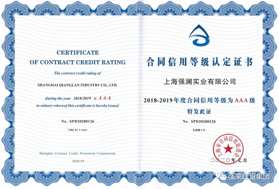 近日,上海市合同信用促进会发来证书,上海强荣建设集团有限公司、上海强澜实业有限公司双双被评2018-2019年度上海市“守合同重信用”最高等级AAA级企业。这是自2004年起强荣集团连续16年荣获AAA级企业殊荣,再次彰显了强荣集团社会信誉度和品牌影响力。强澜实业公司作为强荣集团下属独立子公司,继承和发扬了集团公司守合同、重信用的优良传统,首次获此殊荣。