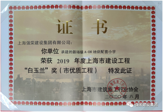 近日,在上海市建筑施工行业协会2019年度“白玉兰”奖观摩工程巡礼大会上,强荣建设集团承建的浦东新区新场镇A一06地块配套小学项目被授予2019年度上海市建设工程“白玉兰”奖。