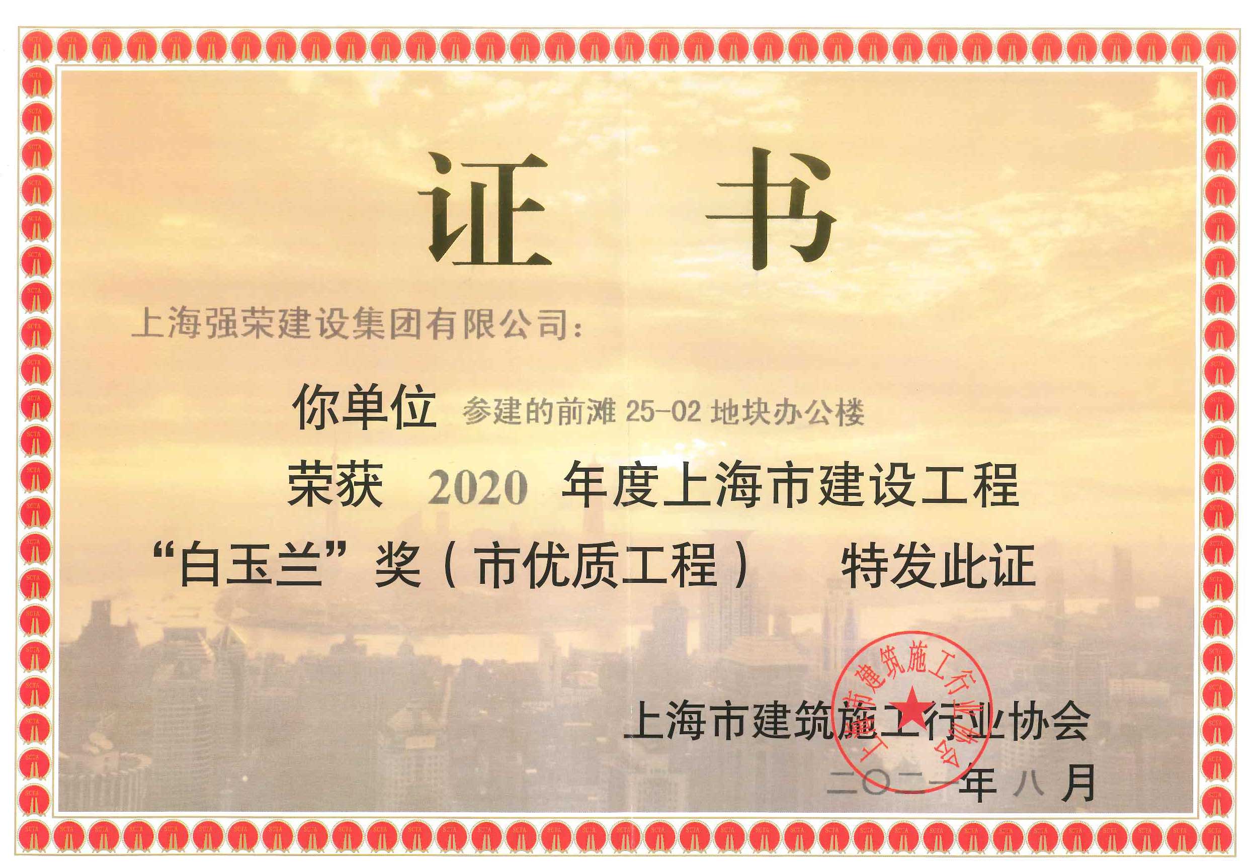 集团公司参建的前滩25-02地块办公楼项目荣获2020年度上海市建设工程“白玉兰”奖